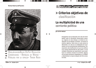 Proseguimos con la traducción de la obra la Revolución Conservadora alemana. Llegamos en esta entrega a un intento de clasificación de las distintas corrientes en función de criterios objetivos. Dicha tarea no está exenta de dificultades a la vista de la multiplicidad del movimiento y de sus extraordinarias ramificaciones. Precisamente, esta clasificación es lo que nos confirma en la riqueza desmesurada de este sector y en las múltiples influencias que experimentó y que constituyen un verdadero mosaico de corrientes, algunas de las cuales terminaron integrándose en el NSDAP y disolviéndose la mayoría después del 30 de enero de 1933.