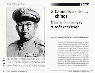 Curioso e inédito estudio sobre el «fascismo chino» escrito por un licenciado en historia por la Universidad Autónoma de Barcelona, de origen chino. El articulo ha constituido una sorpresa para esta revista que ignoraba completamente la existencia de una traducción china del fascismo europeo, pero, en cualquier cso, demuestra la universalidad del fenómeno y su arraigo mundial. Sorprende, así mismo, que el fascismo chino surgiera en el interior del Kuomintang como asociación secreta. Y sorprende, finalmente, tanto las similitudes del fascismo chino con el europeo, como su originalidad y adaptación a la tradición local.